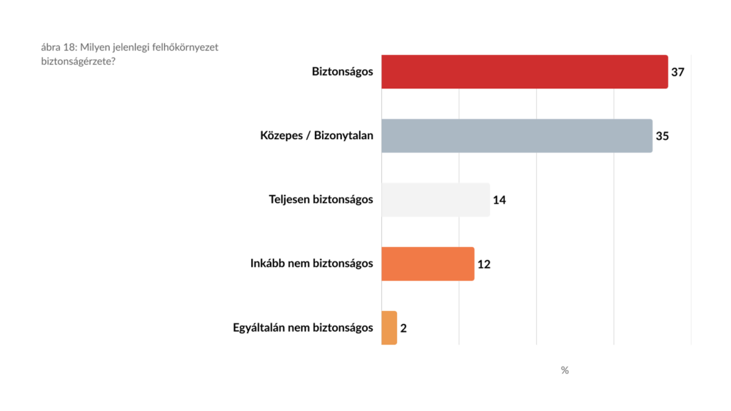 Sokkoló adat, hogy mindössze a válaszadók fele (51%) érzi biztonságosnak, vagy nagyon biztonságosnak felhőkörnyezetüket. A többiek mind úgy dolgoznak, hogy kisebb-nagyobb mértékben állandó bizonytalanságban vannak.