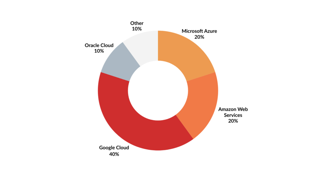 Az első helyet a Google Cloud foglalja el. A 40%-os részesedés analitikai és AI/ML képességei mellett annak is köszönhető, hogy sok vállalkozás második vagy harmadik szolgáltatóként alkalmazza.