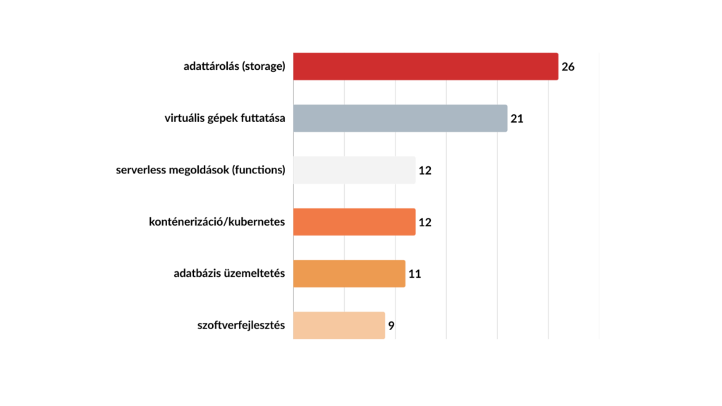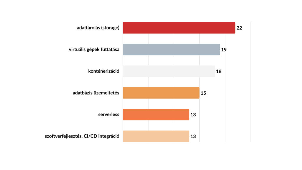 Az adatokból látható, hogy a legtöbb szervezet többféle szolgáltatást is kombinál: leggyakrabban az adattárolást és a virtuális gépek üzemeltetését.