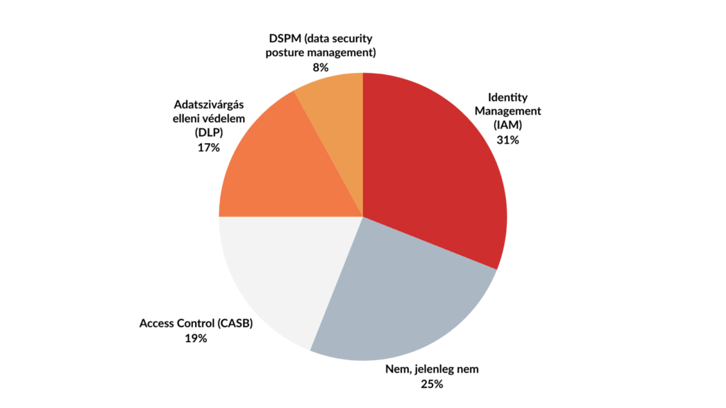 Az adatszivárgás elleni védelem (DLP) 17%-os aránya mutatja hogy bár fontos a szellemi tulajdon védelme, sok helyen még kihívást jelent a felhős adatok tartalom alapú szűrése.
