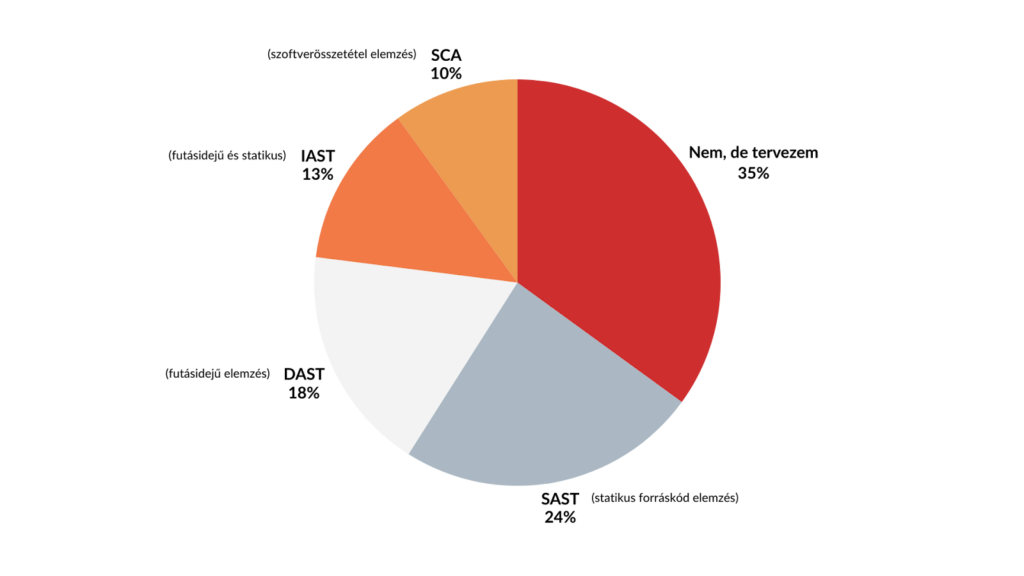A biztonsági eszközöket használók túlnyomó többsége (24%) statikus forráselemzést (SAST) végez, míg a futásidejű elemzés (DAST) aránya 18%. Futásidejű és statikus elemzést (IAST) csak 13%, szoftverösszetétel-elemzést csak 11% használ.